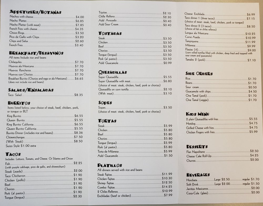 Choice of steak, chicken, ground beef, pork or chorizo with rice and beans.